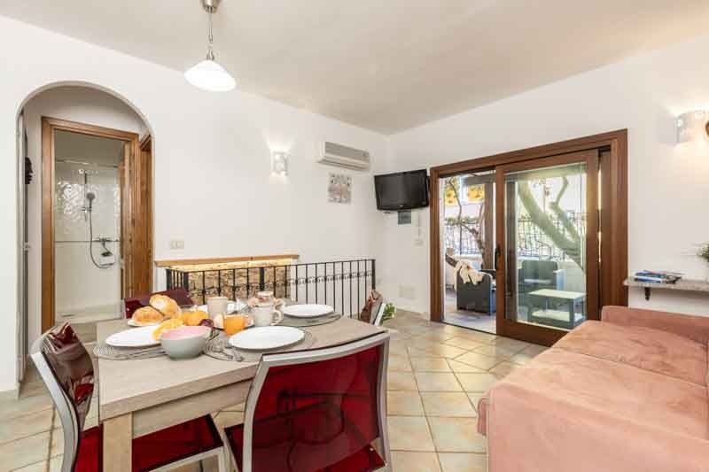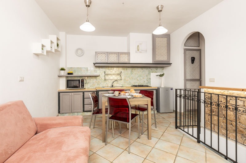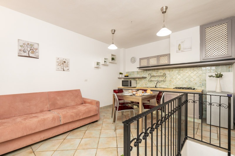 La zona giorno è accogliente e funzionale, con angolo cottura, divano e tavolo da pranzo.