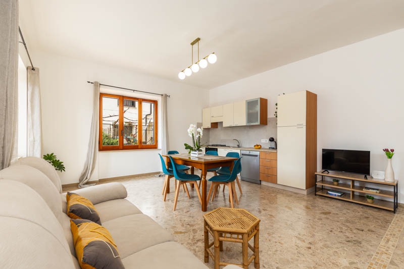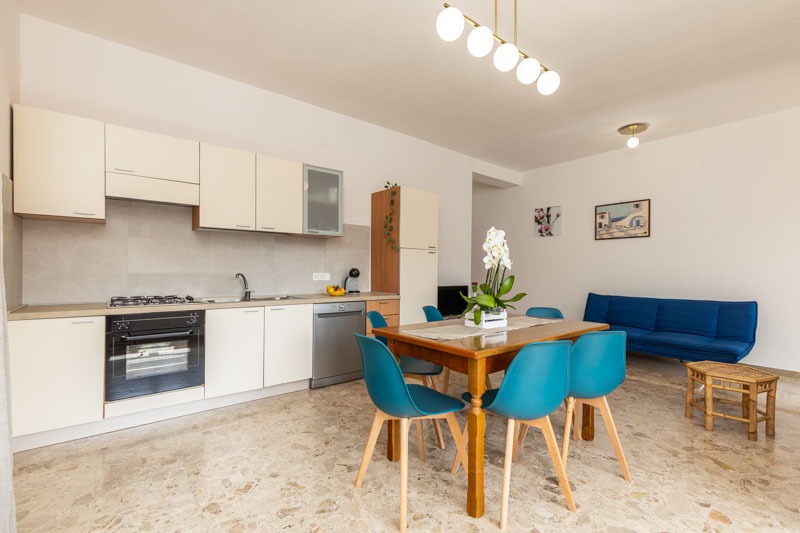 Il salotto è accogliente e luminoso, con zona relax e zona pranzo, mentre la cucina è comoda e ben attrezzata, ideale per chi ama cucinare anche in vacanza.